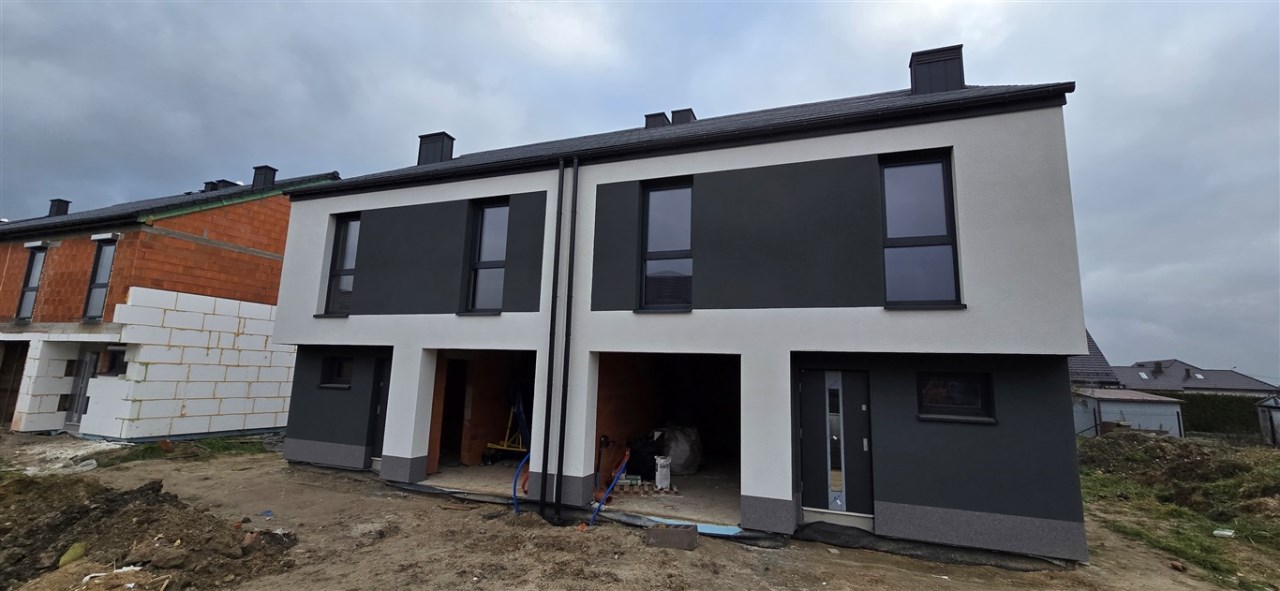 Ściany budynku zbudowane z pustaka ceramicznego z zewnątrz ocieplone styropianem 20 cm. . Dom oddzielony podwójnym murem z dylatacją i styropianem. Ściany zewnętrze domu wykończone oraz otynkowane w kolorach szaro-antracytowych. Dach skośny pokryty dachówka ceramiczną koloru antracytowego. Rynny z tworzywa posiadające osadnik rynnowy. Zapewniamy ciepły montaż okien co zapewnia szczelność i znaczne obniżenie kosztów ogrzewania. Okna PCV, trzyszybowe, od wewnątrz białe, z zewnątrz antracytowe. Wszystkie okna na piętrze i parterze wraz z dużym tarasowym posiadają elektryczne rolety zewnętrzne, schowane w elewacji. Zamontowane parapety zewnętrzne zamontowane na styrodurze (XPS) – ciepły montaż. Zostały także wygłuszone, co daje większy komfort podczas opadów. Eleganckie drzwi wejściowe z nowoczesnym długim pochwytem, szklone typu lustro weneckie. Brama garażowa koloru antracytowego, z możliwością automatycznego otwierana na pilot lub manualnie na klucz.