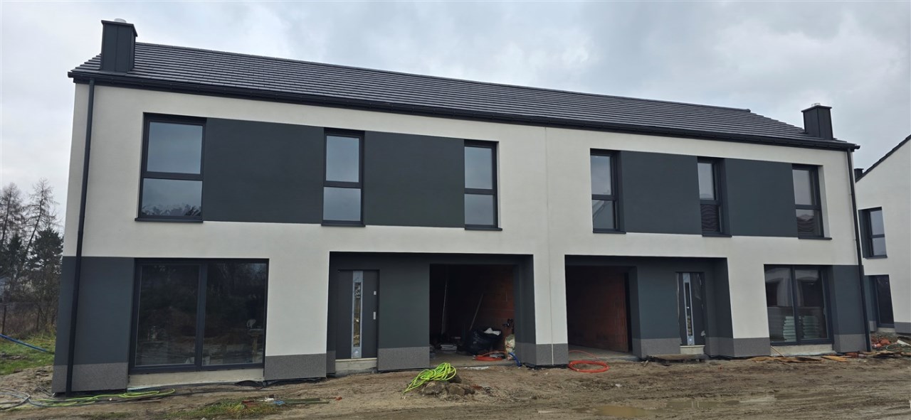 Ściany budynku zbudowane z pustaka ceramicznego z zewnątrz ocieplone styropianem 20 cm. . Dom oddzielony podwójnym murem z dylatacją i styropianem. Ściany zewnętrze domu wykończone oraz otynkowane w kolorach szaro-antracytowych. Dach skośny pokryty dachówka ceramiczną koloru antracytowego. Rynny z tworzywa posiadające osadnik rynnowy. Zapewniamy ciepły montaż okien co zapewnia szczelność i znaczne obniżenie kosztów ogrzewania. Okna PCV, trzyszybowe, od wewnątrz białe, z zewnątrz antracytowe. Wszystkie okna na piętrze i parterze wraz z dużym tarasowym posiadają elektryczne rolety zewnętrzne, schowane w elewacji. Zamontowane parapety zewnętrzne zamontowane na styrodurze (XPS) – ciepły montaż. Zostały także wygłuszone, co daje większy komfort podczas opadów. Eleganckie drzwi wejściowe z nowoczesnym długim pochwytem, szklone typu lustro weneckie. Brama garażowa koloru antracytowego, z możliwością automatycznego otwierana na pilot lub manualnie na klucz.