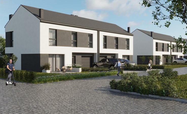 Zagospodarowanie terenu: wybrukowane drogi osiedlowe, podjazd do garażu z kostki brukowej, prywatna działka wyrównana i ogrodzona siatką panelową koloru antracytowego,.
