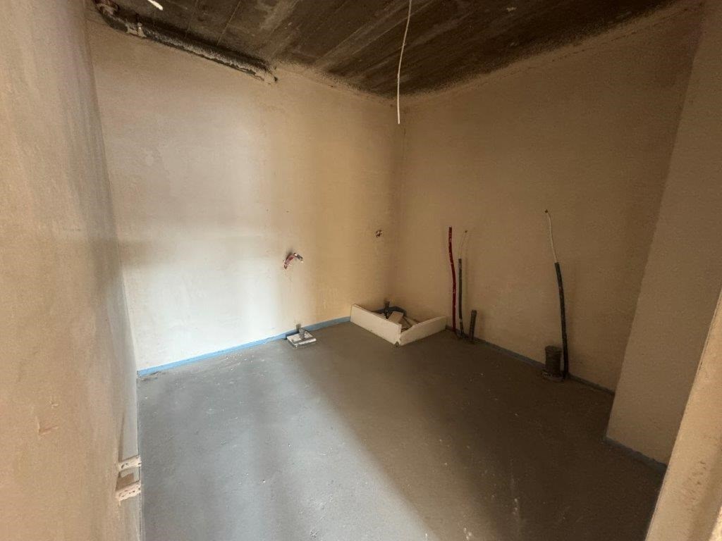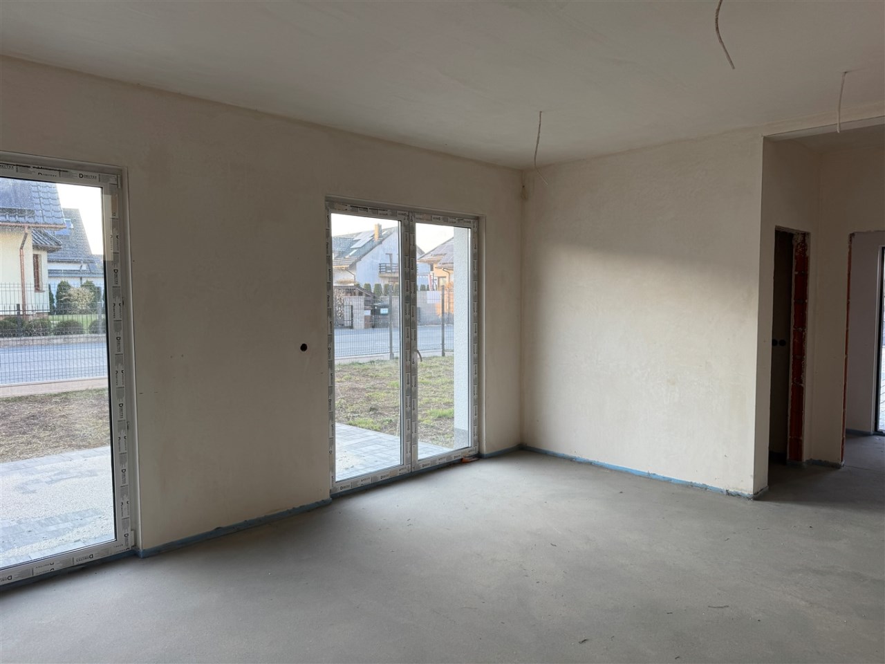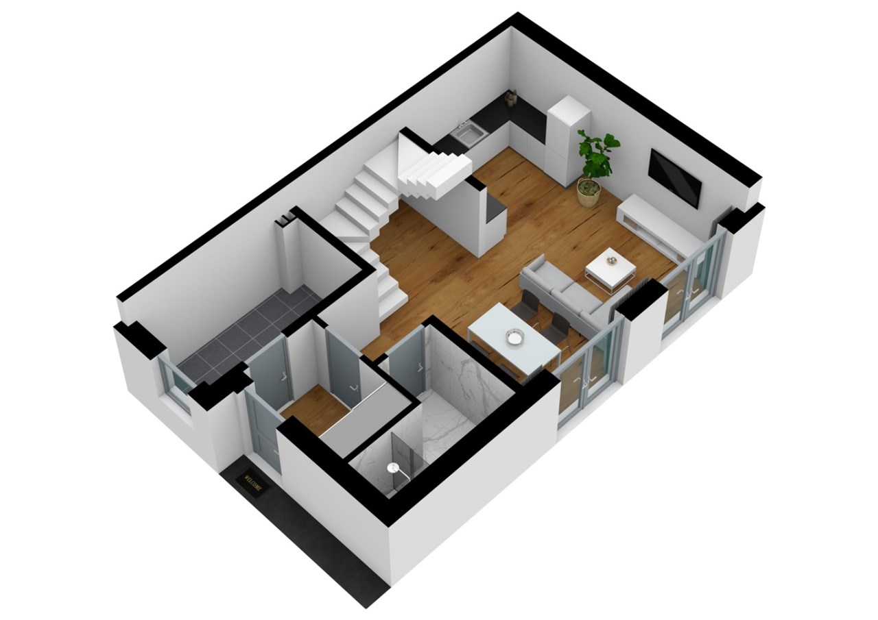 Parter: wiatrołap(z miejscem na szafę), pomieszczenie gospodarcze lub pokój (7mkw) , łazienka, salon z jadalnią i kuchnia. Na piętro prowadzą schody wylewane, Na wyjściu z salonu taras.